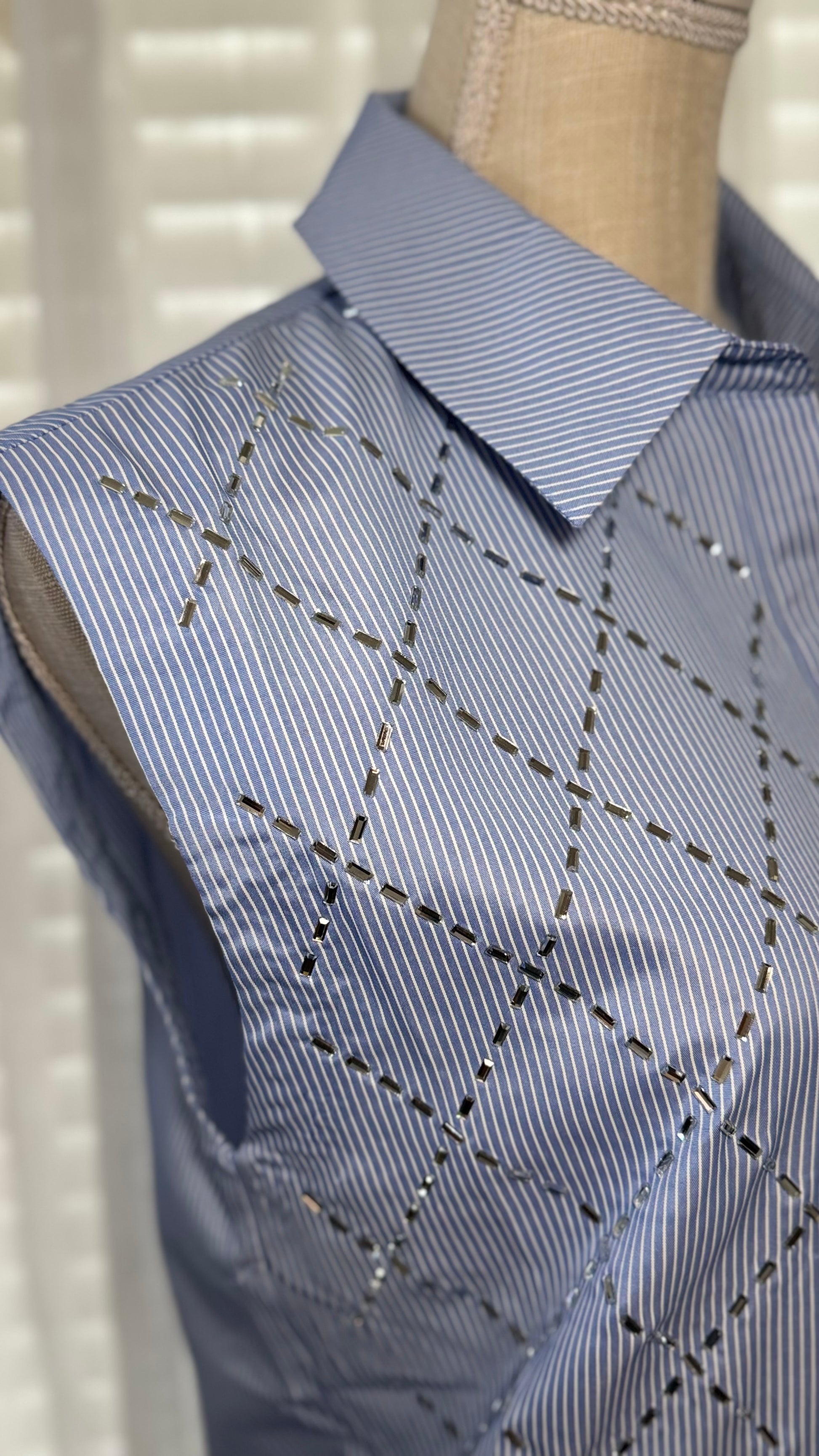 Reinventada con un toque de brillo en esta camisa de botones en tono azul cielo con rayas blancas.