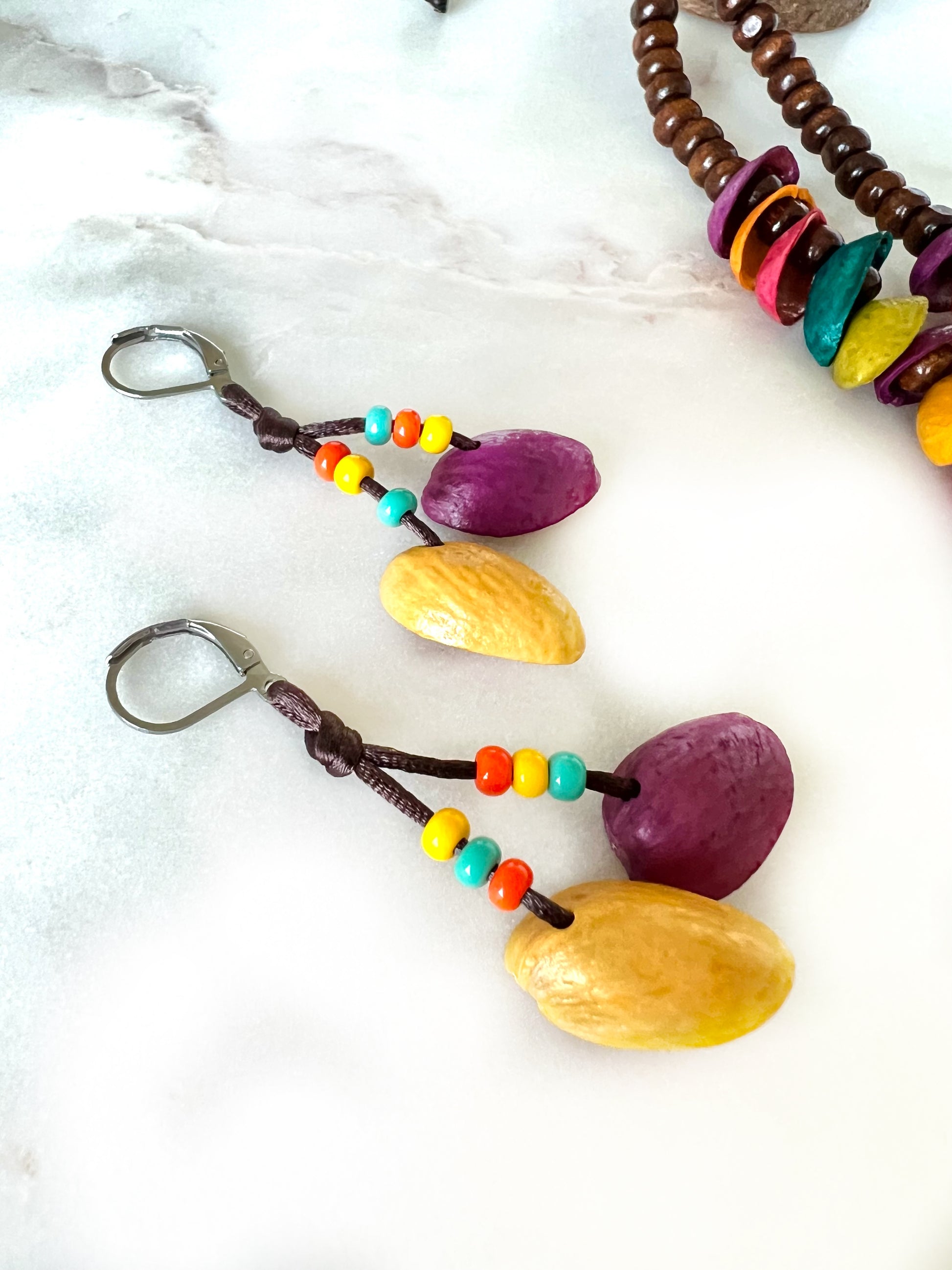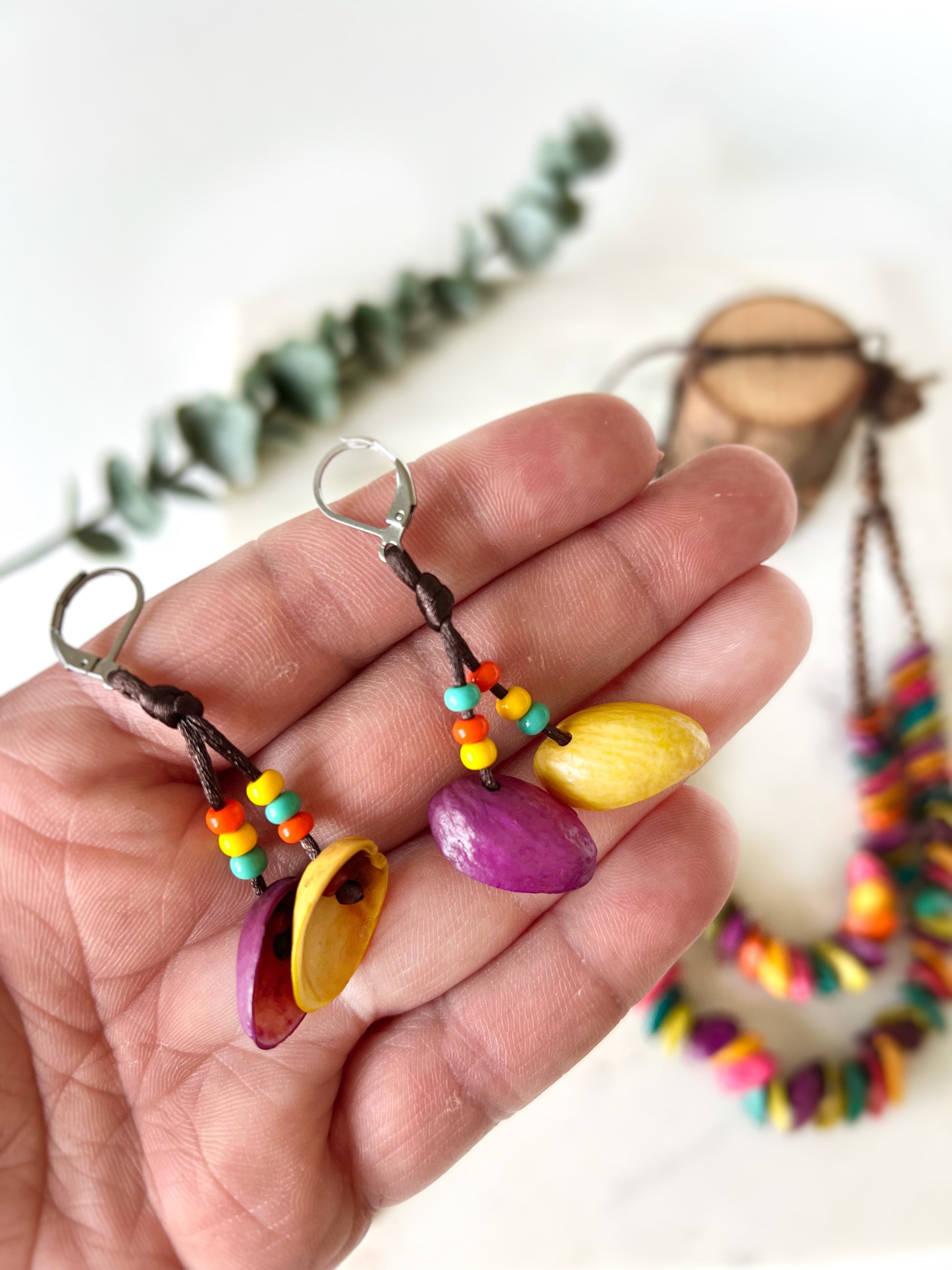 Materiales: Cáscara de pistacho natural, pigmentos naturales, madera natural extraída del suelo, hilo encerado con cera natural vegetal y fibras naturales.